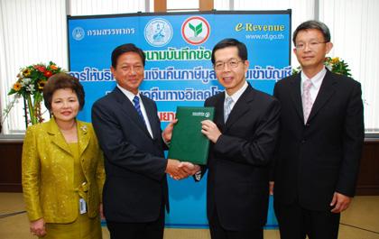 นายประสาร ไตรรัตน์วรกุล กรรมการผู้จัดการ ธนาคารกสิกรไทย และนายศานิต ร่างน้อย อธิบดีกรมสรรพากร ร่วมลงนามในบันทึกข้อตกลงการให้บริการโอนเงินคืนภาษีมูลค่าเพิ่มเข้าบัญชีเงินฝากธนาคารของผู้ขอคืนภาษีทางอิเล็กทรอนิสก์ ซึ่งธนาคารกสิกรไทยถือเป็นธนาคารแรกในประเทศไทยที่เปิดให้บริการดังกล่าว ณ ห้องรับรอง อาคารกรมสรรพากร เมื่อเร็วๆ นี้