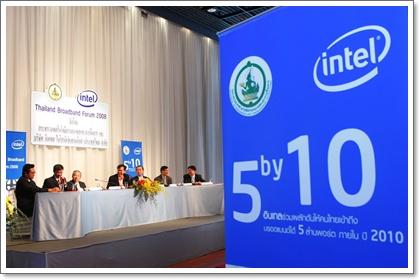 อินเทล ไมโครอิเล็กทรอนิกส์ (ประเทศไทย) จำกัด ร่วมกับ กระทรวงเทคโนโลยีสารสนเทศและการสื่อสาร จัดเสวนาในหัวข้อเรื่อง “ไทยแลนด์ บรอดแบนด์ ฟอรั่ม 2008” ผนึกกำลังพันธมิตรในวงการโทรคมนาคมและไอที ได้แก่ คณะกรรมการกิจการโทรคมนาคมแห่งชาติ (กทช.) สถาบันเพื่อการพัฒนาประเทศไทย (ทีดีอาร์ไอ) บริษัท ทรู คอร์ปอเรชั่น จำกัด และบริษัท ทริปเปิลที บรอดแบรนด์ จำกัด ร่วมแสดงวิสัยทัศน์และความคิดเห็นต่อการพัฒนาระบบอินเทอร์เน็ตความเร็วสูง (บรอดแบนด์) ของประเทศไทยในปัจจุบัน รวมถึงแนวโน้มและคุณประโยชน์ของบรอดแบนด์และเทคโนโลยีที่เกี่ยวข้องในมุมมองต่างๆ อาทิ ด้านเศรษฐกิจ การศึกษา และการพัฒนาสังคม โดยอินเทลชักชวนให้ทุกฝ่ายร่วมปณิธาน ‘5 by 10’ เพื่อเป็นจุดมุ่งหมายร่วมกันในการผลักดันให้มีจำนวนการใช้บรอดแบนด์ในไทยแตะ 5 ล้านพอร์ตภายในปี ค.ศ. 2010 หรืออีกสองปีข้างหน้า