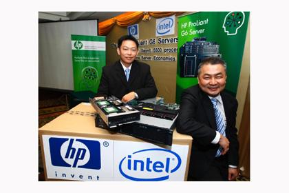 จากภาพ : (จากซ้าย) คุณธนาวัฒน์ กีรสิทธ์เสริฐ ผู้จัดการผลิตภัณฑ์ Industry Standard Servers (ISS) กลุ่มธุรกิจ เทคโนโลยี โซลูชั่นส์ กรุ๊ป บริษัท ฮิวเลตต์-แพคการ์ด (ประเทศไทย) จำกัด และ คุณศุภลักษณ์ สัปตตั้งตระกูล MNC Account Manager บริษัท อินเทล ไมโครอิเล็กทรอนิกส์ (ประเทศไทย) จำกัด ภายในงานแถลงข่าวเปิดตัวเซิร์ฟเวอร์ HP ProLiant G6 ใหม่ล่าสุด