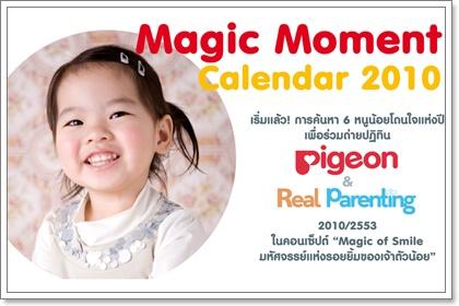 เริ่มเปิดรับสมัครกันอีกแล้ว!!! กับโครงการ “Magic Moment Calendar ปีที่ 3” กิจกรรมดีๆ ที่ค่ายมุ่งพัฒนา อินเตอร์แนชชั่นแนล จำกัด (มหาชน) หรือ “พีเจ้น” ร่วมกับนิตยสาร เรียลพาเรนติ้ง เตรียมเปิดสตูดิโอเพื่อค้นหา 6 หนูน้อยโดนใจแห่งปี เพื่อเป็นหนูน้อยนายแบบ-นางแบบ ถ่ายปฎิทินหนูน้อย “พีเจ้น” ประจำปี 2553 นี้ โดยคุณพ่อคุณแม่ที่สนใจสามารถส่งรูปถ่ายลูกน้อยตั้งแต่วัยแรกเกิด-2 ปี จำนวน 3 รูป ในอิริยาบถต่างๆ ที่สื่อถึง “Magic of Smile มหัศจรรย์แห่งรอยยิ้มของเจ้าตัวน้อย” อาทิ รอยยิ้มอิ่มอร่อย, ยิ้มประจบประแจง, รอยยิ้มดาราหน้ากล้อง ฯลฯ โดยระบุชื่อ-นามสกุล วันเดือนปีเกิด ของลูกน้อย พร้อมที่อยู่และเบอร์โทรศัพท์ที่ติดต่อหลังภาพถ่าย และระบุผลิตภัณฑ์พีเจ้นที่ใช้ ส่งมาที่นิตยสาร Real Parenting ตั้งแต่วันนี้-15 สิงหาคม นี้เท่านั้น สำหรับคุณพ่อคุณแม่ท่านใดที่สนใจ สามารถคลิกหาข้อมูลเพิ่มเติมได้ที่ www.moongpattana.com