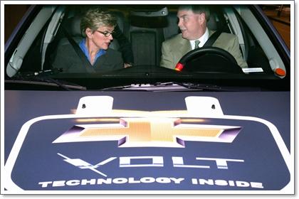 คำบรรยายใต้ภาพ: เจนนิเฟอร์ แกรนโฮล์ม ผู้ว่าการรัฐมิชิแกน (ซ้าย) และ ฟริตซ์ เฮนเดอร์สัน ประธานกรรมการ และประธานเจ้าหน้าที่บริหาร เจนเนอรัล มอเตอร์ส เตรียมขับรถออกสู่งานแถลงข่าว ระหว่างงานแถลงข่าวเปิดห้องแล็บพัฒนาระบบแบตเตอรี่ระดับโลกแห่งใหม่ของจีเอ็ม ซึ่งถือเป็นห้องแล็บพัฒนาแบตเตอรี่สำหรับยานยนต์ที่ใหญ่ที่สุดในสหรัฐอเมริกา ที่ศูนย์เทคโนโลยีจีเอ็ม ในเมืองวอร์เรน รัฐมิชิแกน มีขนาด 33,000 ตารางฟุต พร้อมช่องทดสอบ 160 ช่อง และห้องทดสอบอุณหภูมิอีก 42 ห้อง