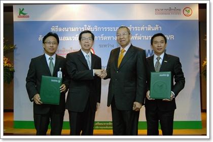 นายประสาร ไตรรัตน์วรกุล (ที่ 2 จากซ้าย) กรรมการผู้จัดการ ธนาคารกสิกรไทย และนายปรีชา ประกอบกิจ (ที่ 2 จากขวา) กรรมการผู้จัดการ บริษัท แอมเวย์ (ประเทศไทย) จำกัด ลงนามในความร่วมมือให้บริการชำระค่าสินค้าและบริการผ่านระบบเสียงตอบรับอัตโนมัติ (IVR) ให้กับแอมเวย์เป็นรายแรกของประเทศไทย เพื่อเพิ่มช่องทางการชำระเงินที่สมบูรณ์แบบและปลอดภัยให้กับนักธุรกิจและสมาชิกแอมเวย์กว่า 1 ล้านคน ทั่วประเทศ ณ ธนาคารกสิกรไทย สำนักพหลโยธิน เมื่อเร็ว ๆ นี้
