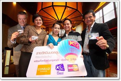 นายสถาพร สิริสิงห (ขวา) รองประธานเจ้าหน้าที่บริหารอาวุโส ฝ่ายการตลาดเพื่อการ สันทนาการ “เคทีซี” หรือ บริษัท บัตรกรุงไทย จำกัด (มหาชน) มร.มันน์เฟรด พิปเปอร์ (ซ้าย) ผู้จัดการทั่วไป โรงแรมคอนราด กรุงเทพฯ และมิส ไอลีน วี (ที่ 2 จากซ้าย) รองประธานและผู้จัดการประจำประเทศไทย มาสเตอร์การ์ด เวิลด์วายด์ ร่วมกันมอบรางวัลให้แก่ผู้โชคดี นาวาตรี รณยุทธ โอสถานนท์ (ที่ 2 จากขวา) และนางสาวกันตยา วีระกรพานิช (กลาง) ที่ชำระค่ามัดจำแพ็คเกจวิวาห์ผ่านบัตรเครดิต เคทีซี-มาสเตอร์การ์ดในงาน Conrad Wedding Fair 2009 โดยรางวัลประกอบด้วยตั๋วเครื่องบิน-ไปกลับ กรุงเทพฯ-เชียงใหม่ 2 ที่นั่ง พร้อมประสบการณ์บินบอลลูนฟรีที่จังหวัดเชียงใหม่ รวมมูลค่าของรางวัลทั้งสิ้นกว่า 100,000 บาท