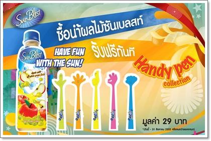บริษัท ซาน มิเกล มาร์เก็ตติ้ง (ประเทศไทย) จำกัด ผู้ผลิตและจำหน่ายน้ำผลไม้ซันเบลสท์ ต้อนรับเปิดเทอมใหม่ด้วยปากกานำเข้า Handypen Collection สุดเก๋ 5 แบบ 5 สไตล์ ที่จะมาให้วัยโจ๋ได้จับจองเป็นเจ้าของเพียงซื้อน้ำแอปเปิ้ลซันเบลสท์ 1 ขวดวันนี้ รับฟรีปากกา Handypen ทันที 1 ด้ามมูลค่า 29 บาท รีบหาสะสมให้ครบทั้ง 5 แบบกันได้แล้วตั้งแต่วันนี้ – 31 สิงหาคมนี้ ที่คาร์ฟูร์, โฮมเฟรชมาร์ท, 108 shop และร้านค้าทั่วไป