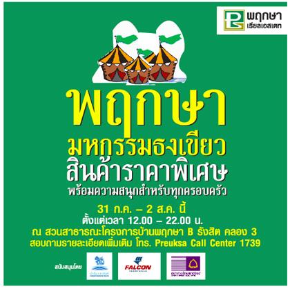 บริษัท พฤกษา เรียลเอสเตท จำกัด (มหาชน) ร่วมกับ สิงห์ คอร์ปอเรชั่น และ บมจ. ฟอลคอน อินชัวรันส์ จัดงาน “พฤกษามหกรรมธงเขียว สินค้าราคาพิเศษ” เพื่อช่วยลดภาระค่าใช้จ่ายในการซื้อสินค้าอุปโภคบริโภคให้กับลูกค้าของพฤกษา ในระหว่างวันที่ 31 ก.ค. – 2 ส.ค. นี้ เวลา 12.00 น. – 22.00 น. ณ โครงการบ้านพฤกษา B รังสิต คลอง 3