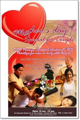 เพียงควงคู่ คุณแม่, เพื่อนสาว หรือ คนพิเศษของคุณ รับบริการนวดผ่อนคลาย RRD Package พร้อมกัน 2 ท่าน ในโปรโมชั่น “Mother’s day Special for Couple” รับสิทธิพิเศษส่วนลด 20% ทันทีระหว่าง วันที่ 1-31 สิงหาคม 2552 เวลา 10.00-16.00 น. รายละเอียดเพิ่มเติม โทรศัพท์ 02-252-9651 หรือ www.ruamrudeehealthmassage.com