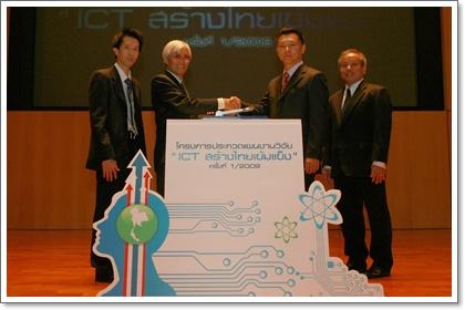นายนิมิต ดำรงรัตน์ (ที่สองจากขวา) ที่ปรึกษารัฐมนตรีว่าการกระทรวงเทคโนโลยีสารสนเทศและการสื่อสาร ร่วมด้วยรองศาสตราจารย์ยืน ภู่วรวรรณ (ที่สองจากซ้าย) รองอธิการบดี ฝ่ายเทคโนโลยีสารสนเทศ มหาวิทยาลัยเกษตรศาสตร์ ร่วมเปิดงานการประกวดแผนงานวิจัยครั้งแรกของประเทศ ภายใต้โครงการ “ICT สร้างไทยเข้มแข็ง” เพื่อเปิดโอกาสให้นิสิตนักศึกษา ระดับ ปริญญาตรี – โท – เอก สร้างสรรค์แผนงานวิจัย พร้อมต่อยอดผลิตภัณฑ์ และพัฒนาสู่การเป็นผู้ประกอบใหม่ได้ด้วยตนเอง เปิดรับสมัครแล้ว ตั้งแต่วันนี้ – 31 สิงหาคม 2552 สอบถามรายละเอียดเพิ่มเติมได้ที่ โทร. 02 942 8777 ต่อ 200 หรือ www.ict.bus.ku.ac.th