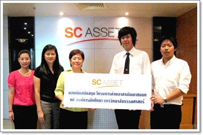 นางจรัญญา ตั้งบรรเจิดสุข (ที่ 3 จากซ้าย) ผู้อำนวยการอาวุโสสำนักทรัพยากรบุคคลและธุรการ บริษัท เอสซี แอสเสท คอร์ปอเรชั่น จำกัด (มหาชน) มอบเงินสนับสนุนให้กับโครงการค่ายอาสาพัฒนาชนบท เพื่อนำไปพัฒนาในด้านสื่อการเรียนการสอนเสริมสร้างความรู้ และพร้อมพัฒนาคุณภาพชีวิตที่ดีให้กับชุมชนโรงเรียนบ้านท่าเรือ จังหวัดพังงา โดยมี นายธนากร สมสุข ประธานค่ายอาสาพัฒนาชนบท องค์การนักศึกษา มหาวิทยาลัยธรรมศาสตร์ เป็นตัวแทนรับมอบ ณ อาคารชินวัตร 3 ถ.วิภาวดีรังสิต เมื่อเร็วๆนี้