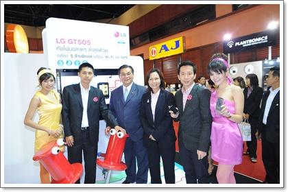 นายณัฐวัชร์ ศิริวงศ์ศาล หัวหน้าฝ่ายการตลาดกลุ่มผลิตภัณฑ์โทรศัพท์มือถือ (ที่ 2 จากซ้าย) บริษัท แอลจี อีเลคทรอนิคส์ (ประเทศไทย ) จำกัด ให้การต้อนรับนายชาญชัย ชัยรุ่งเรือง (ที่ 4 จากขวา) รัฐมนตรีว่าการกระทรวงอุตสาหกรรม พร้อมกับนำชมโทรศัพท์มือถือรุ่นไฮไลท์ อาทิ “LG GT505” โทรศัพท์มือถือหน้าจอสัมผัสที่โดดเด่นด้วย WisePilot Navigation ด้วยการติดตั้งเครื่องรับสัญญาณ GPS ไว้ในตัวเครื่อง และ “LG GM730 อีซี่สมาร์ทโฟน” ที่ทุกฟังก์ชั่นง่ายต่อการเข้าถึงด้วยเทคโนโลยี S Class User Interface ลิขสิทธิ์เฉพาะของแอลจีและระบบปฏิบัติการวินโดวส์ โมบายล์เวอร์ชั่นล่าสุด ณ บูธของแอลจีภายในงาน Thailand Mobile Expo 2009 ณ ศูนย์ประชุมแห่งชาติสิริกิติ์