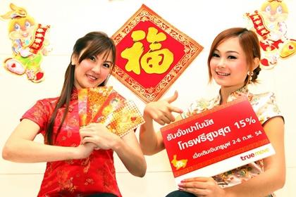 ตรุษจีนปีนี้ ทรูมูฟเตรียมอั่งเปาอวยพรความสุข โชคดี เฮง เฮง เฮง ให้ลูกค้าทรูมูฟแบบเติมเงิน ด้วยแคมเปญ “ทรูมูฟ…อั่งเปาโบนัส” มอบสิทธิพิเศษทุกครั้งที่เติมเงิน รับโบนัสโทรฟรี 10% เมื่อเติมเงินตั้งแต่ 90 บาทขึ้นไป และ 15% เมื่อเติมเงินตั้งแต่ 300 บาทขึ้นไป รับอั่งเปาโบนัสฉลองเทศกาลตรุษจีน ระหว่างวันที่ 2 – 6 กุมภาพันธ์ 2554
