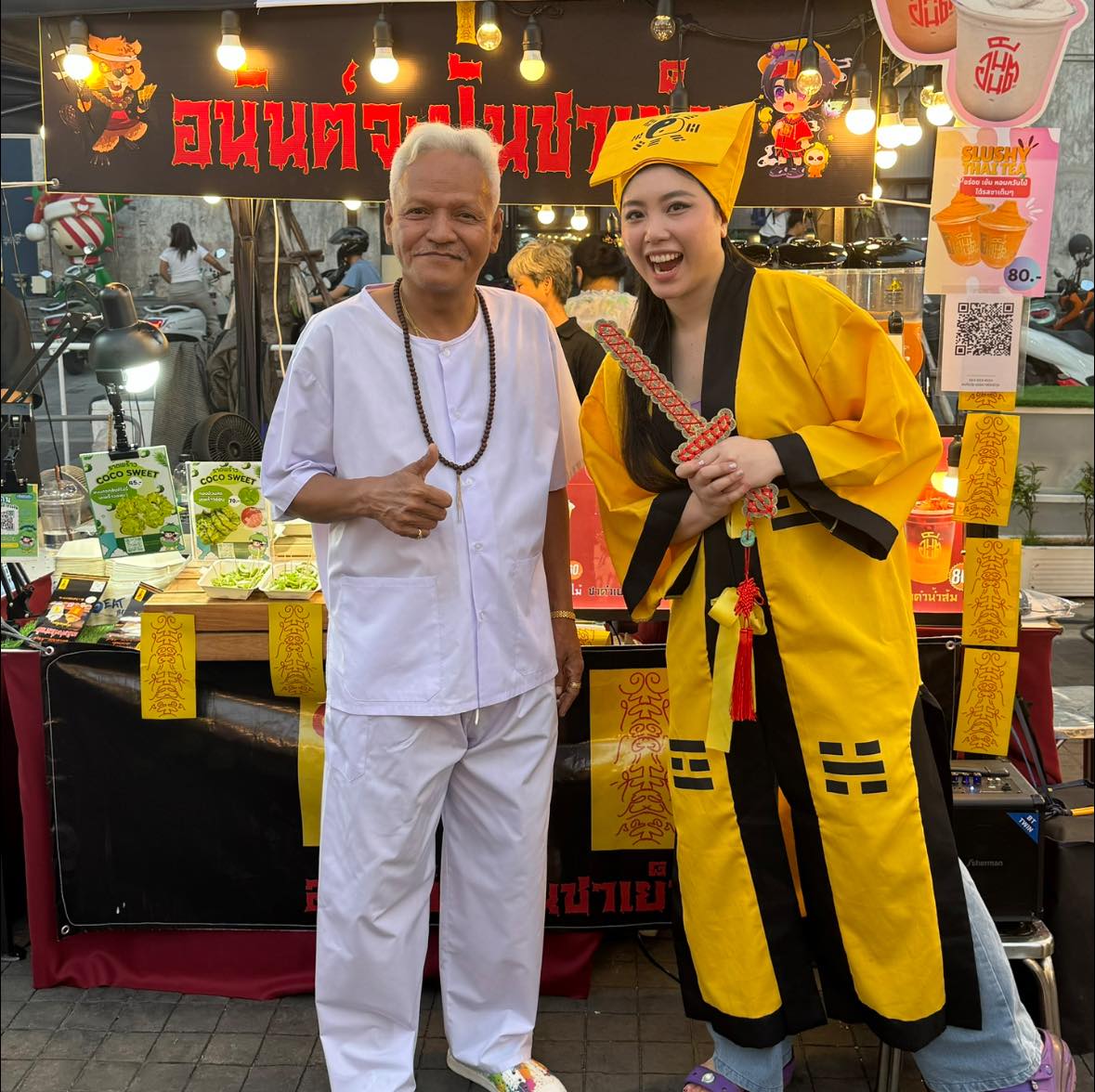 จากนั้นก็มาออกแบบฟอนต์ โลโก้ และคอนเซ็ปต์ร้าน ที่ต้องใช้ผีจีนเพราะมองว่า จดจำง่ายกว่าผีไทย ที่มีหลากหลาย แถมยังเชื่อมโยงกับศาลเจ้าที่ชลบุรีที่ครอบครัวมี อายุมากกว่า 60 ปีแล้ว ส่วนชุดเหลืองอาจารย์ปราบผีมันเป็นความบังเอิญมากกว่า ไม่ได้วางแผนไว้